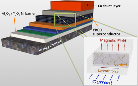 Schematics of a second-generation superconducting wire: YBa2Cu3O7 coated conductor, complex multilayer architecture of inexpensive materials. Inset shows the dynamics of vortices in the conductor in the presence of pinning centers. |
