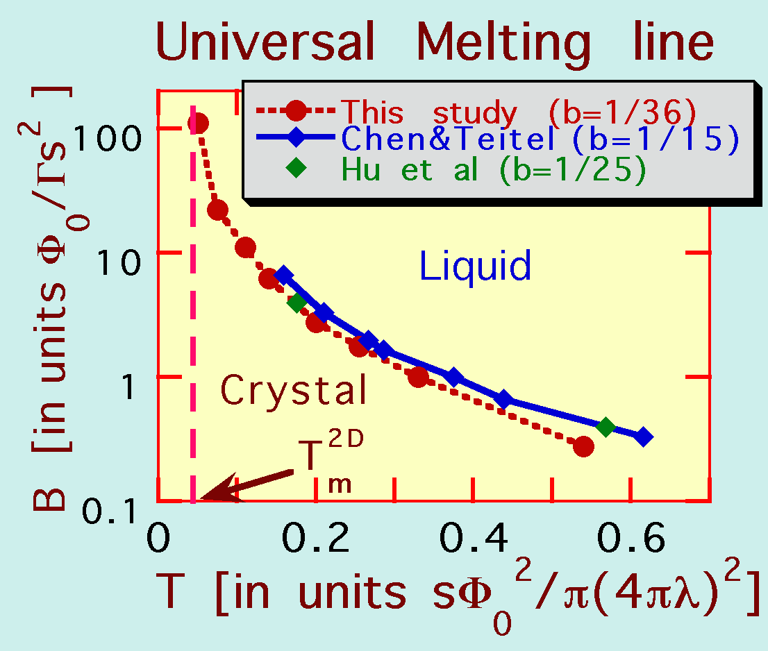 Fig 3: Universal phase diagram of layered superconductors. We compare results of different simulation with different filling factors b.