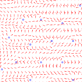 Fig 1: Typical phase and vortex configuration at low temperatures. Phases at the sites of grid are represented by the tilting angles of arrows