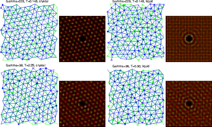 Fig 2: Triangulation patterns in neighboring layers and density-density correlation functions for competing configurations near the melting temperature for two values of the anisotropy factor Gamma.